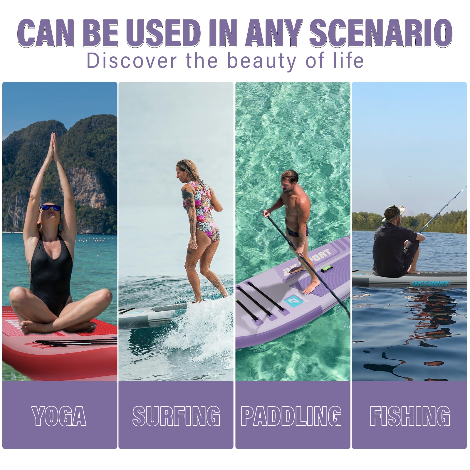 • 【VARIOUS LEISURE METHODS】AKSPORT Padle Board can be used in different water including sea,lakes, rivers or small wavy ocean.The paddle board is 305cm long and 82cm wide and 15cm thick.The carrying capacity is up to 300lb,can accommodate two young people of moderate weight standing on the board at the same time.Apply for all beginner and Intermediate Riders, for paddling, cruising, yoga, fishing, sightseeing in flatwater.