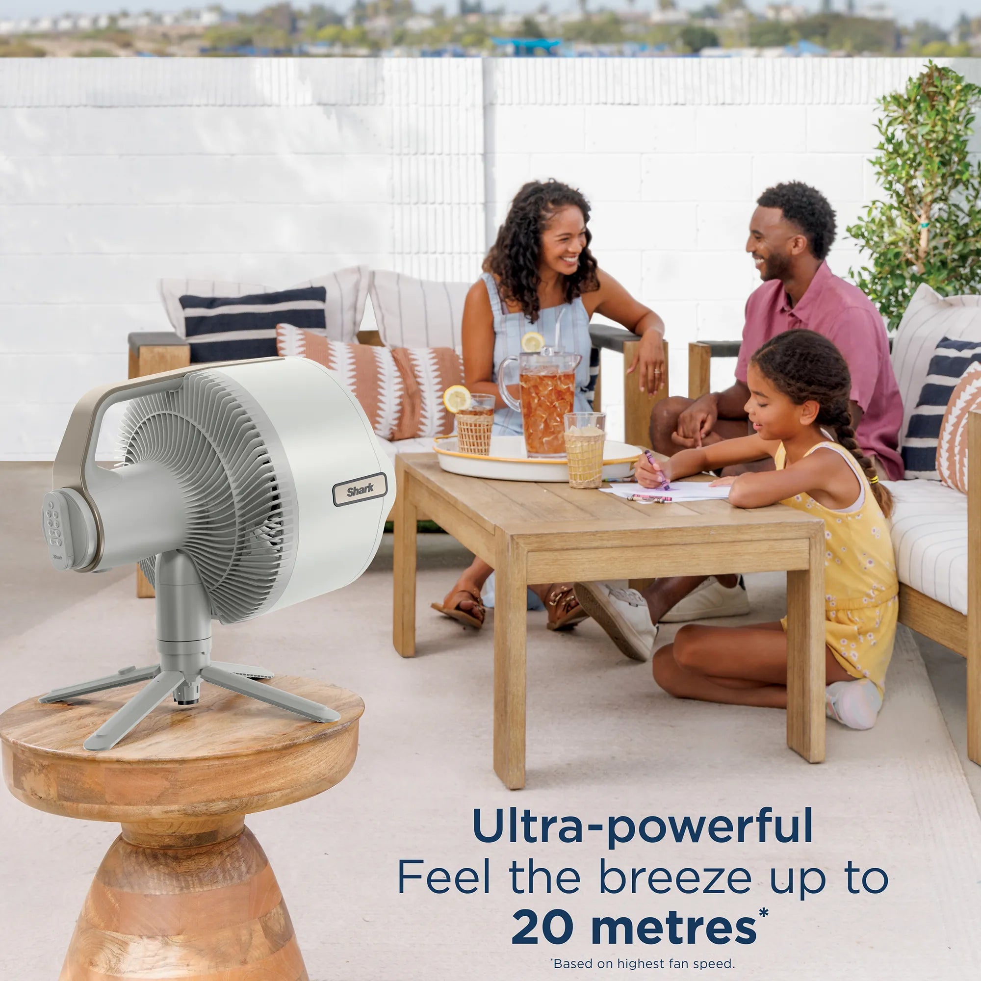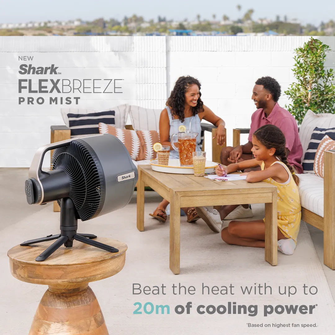 Introducing the Shark FlexBreeze? Pro Mist indoor and outdoor fan with portable misting system ultra-powerful, whisper-quiet, and perfect for any space in your home or beyond the backyard. With a 20m range and weather-resistant design, use it corded or cordless for ultimate flexibility from floor to tabletop. Enjoy up to 24 hours of cordless runtime at speed 1, six hours at speed 3, and two hours at max speed.